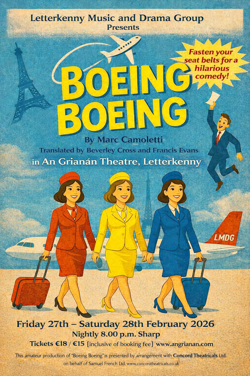 Letterkenny Music & Drama Group are delighted to present for the first time in An Grianán Theatre the smash hit comedy, Boeing Boeing, on Friday and Saturday, February 27 and 28, at 8pm.
