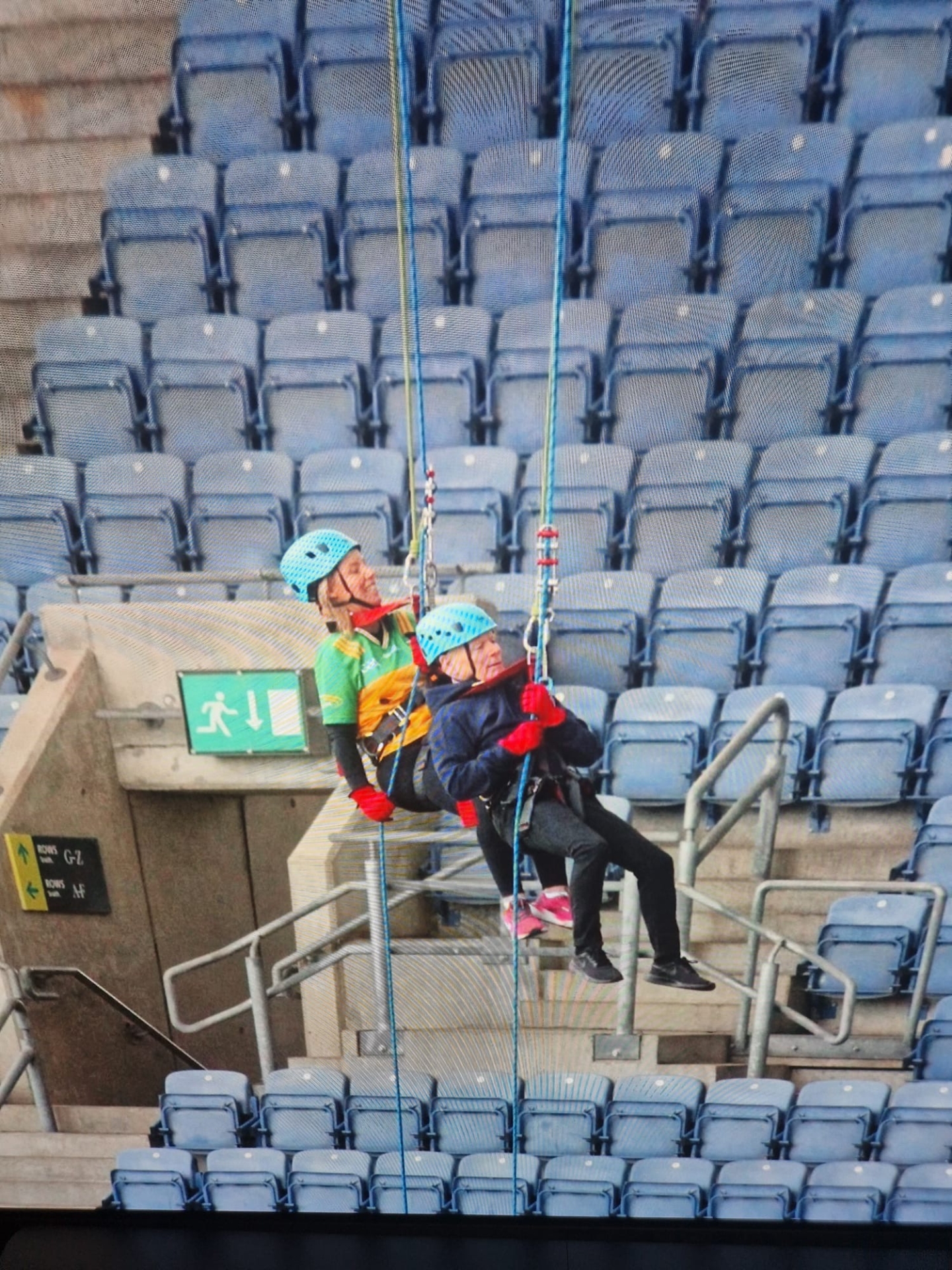 The trio arrived at Croke Park before the safety brief, learning to use the ropes and equipment for the descent. Then, they walked on to the roof and Laura and Robbie went first.