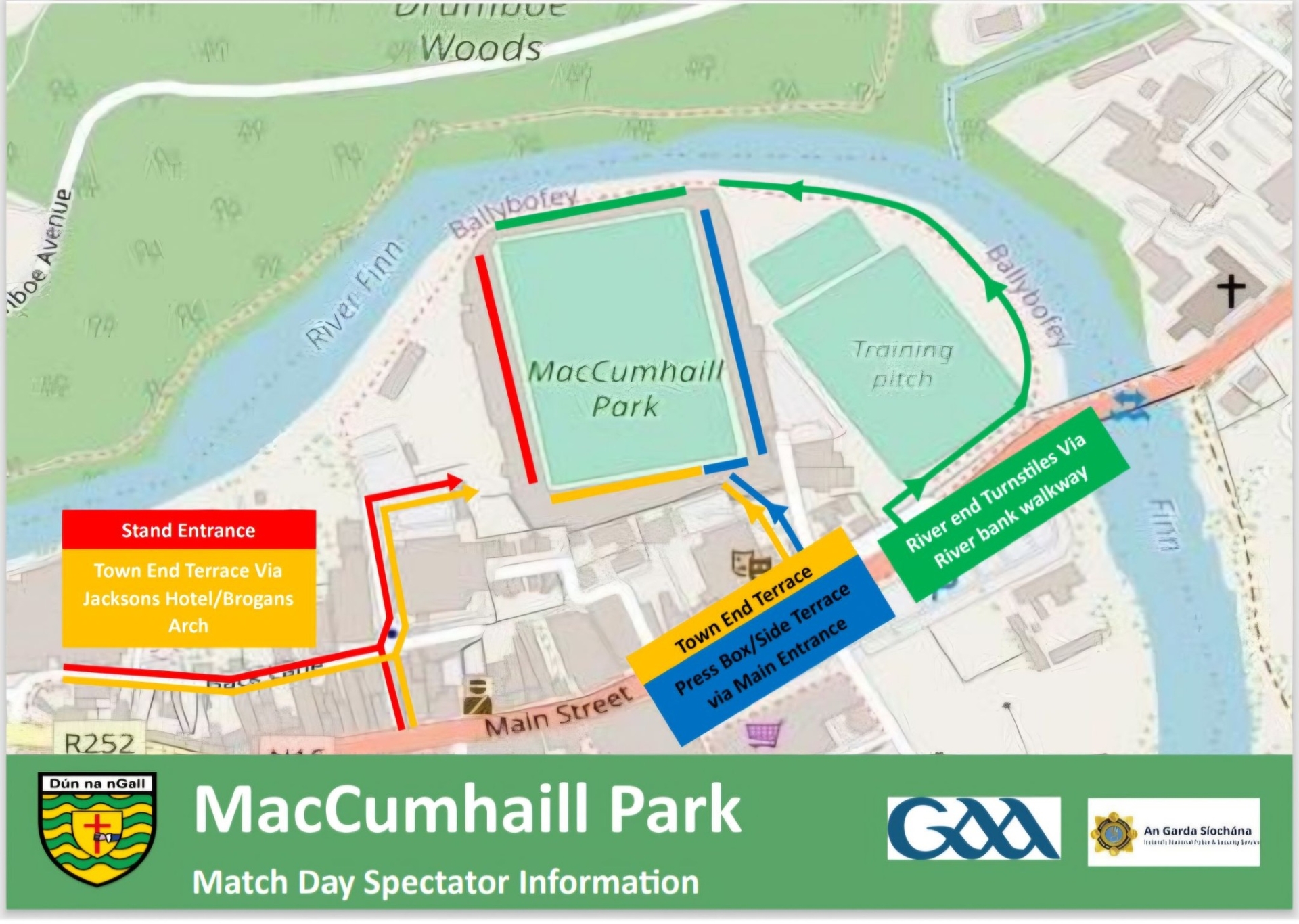 "Only vehicles authorised by Donegal GAA will be permitted access to car park at MacCumhaill Park main entrance. Limited parking for Blue Badge holders is available at the car park at the stand entrance (behind Villa Rose Hotel). Vehicle access to this car park is via Back Road at Jackson’s Hotel. Once this area is full there will be no vehicle access to this area. There is limited disabled parking availability on the Main Street and in car parks in the vicinity of the grounds."