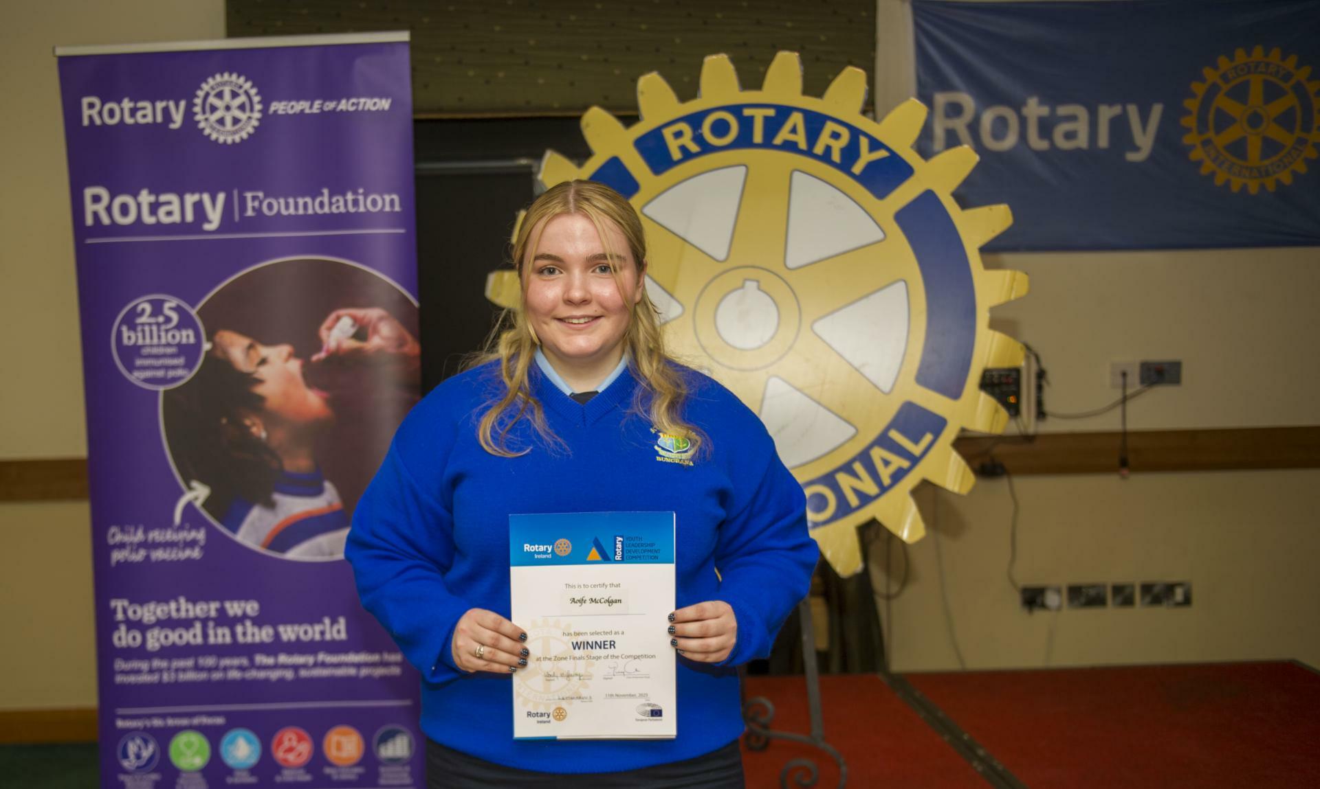 Aoife McColgan, a fifth-year student in Scoil Mhuire, Buncrana, has been selected as the Rotary Zone final winner in this year’s prestigious Rotary Youth Leadership Competition.