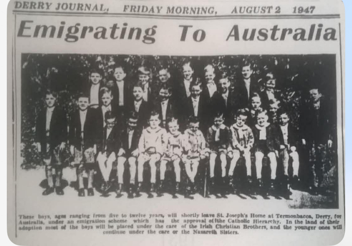 The caption reads: “These boys, ranging from five to twelve years, will shortly leave St Joseph’s Home in Termonbacca, for Australia, under an emigration scheme which has the approval of the Catholic Hierarchy. In the land of their adoption most of the boys will be placed under the care of the Irish Christian Brothers, and the youngest ones will continue under the care of Nazareth Sisters.”