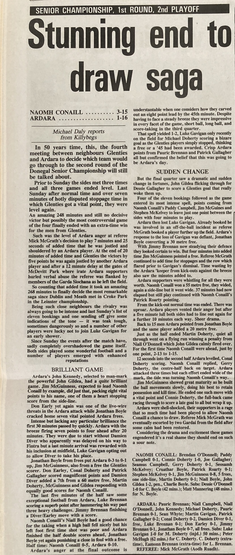 It’s 30 years since one of Donegal’s greatest and most controversial football sagas played out as Naomh Conaill and Ardara gifted us a four-game SFC marathon.