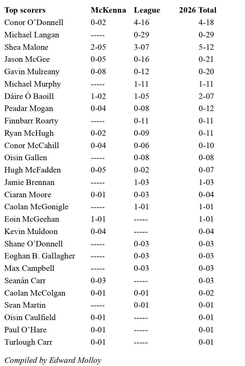 Number of different scorers this year: 27 (McKenna Cup 17, League 21)