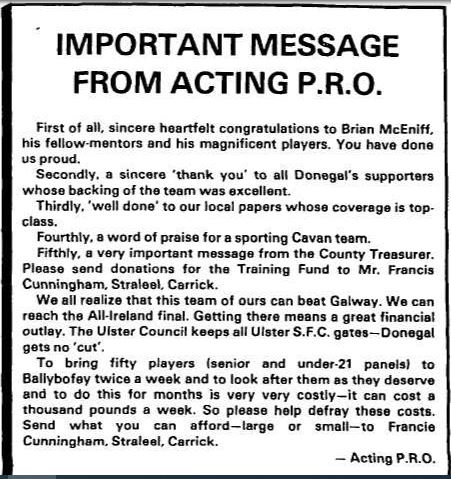 One interesting notice alongside the report of the game in the following week’s Donegal Democrat from the PRO thanked all for their support in winning Ulster and made an appeal for funds to help defray costs for the All-Ireland semi-final.
