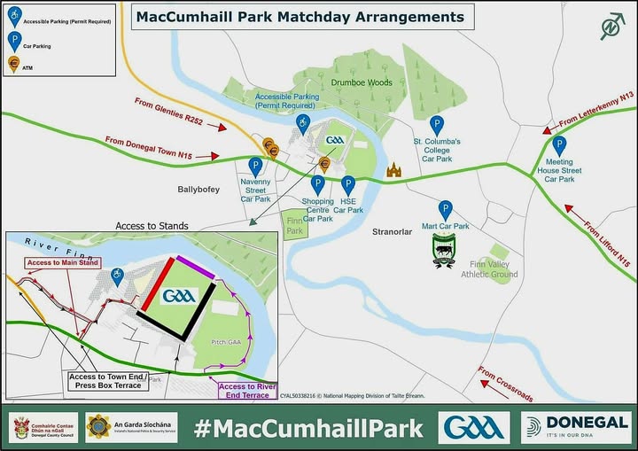 "Only vehicles authorised by Donegal GAA will be permitted access to car park at Mac Cumhaill Park main entrance. Limited parking for Blue Badge holders is available at car park at stand entrance (behind Villa Rose hotel). Vehicle access to this car park is via Back Road at Jackson’s Hotel. Once full there will be no vehicle access to this area. There is limited disabled parking on the Main Street and in car parks in the vicinity of the grounds.