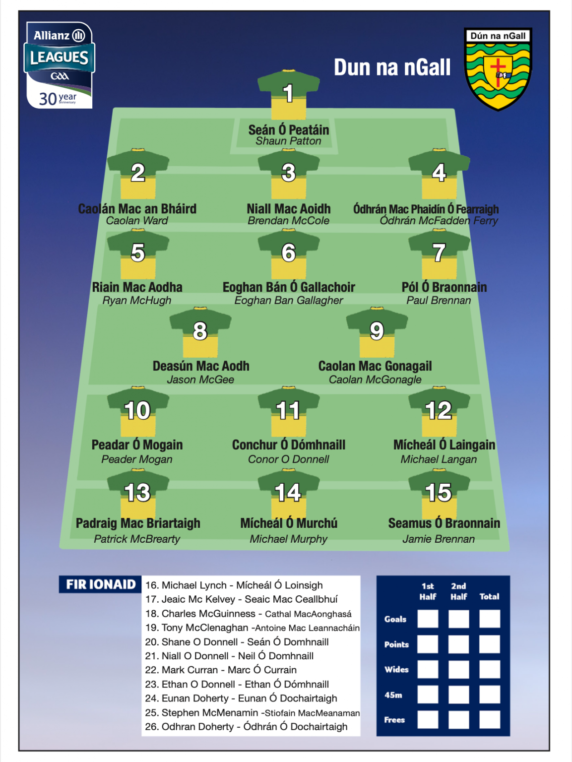 The team that will appear in the matchday programme for Donegal's second Allianz League Division 1 fixture against Kildare has been released this morning.