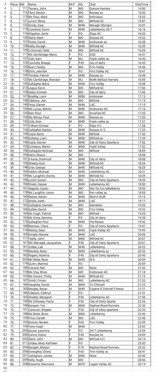 Declan Ferry (Rosses AC) was second in 15:30 with Ramelton's Mark McPaul (Finn Valley) third in 15:33.