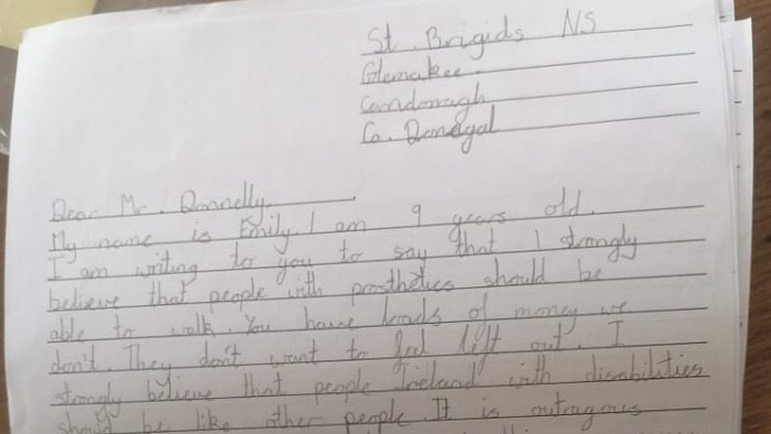 Schoolchildren from Glenmakee National School in Carndonagh have written poignant letters to the Minister for Health in their appeal for the provision of prosthetic limbs for amputees.