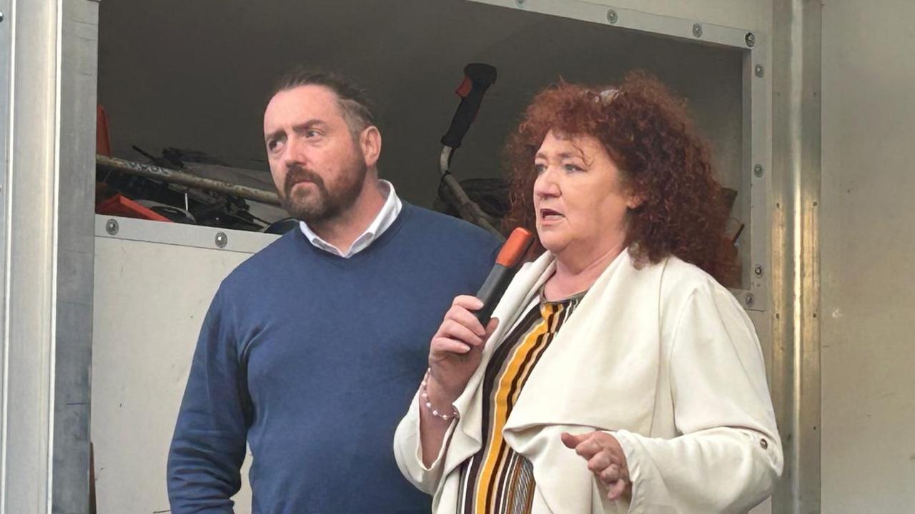 Aontú rep Mary T Sweeney at the signing being erected on the Rahan to Corravaddy road leading to Drumkeen
