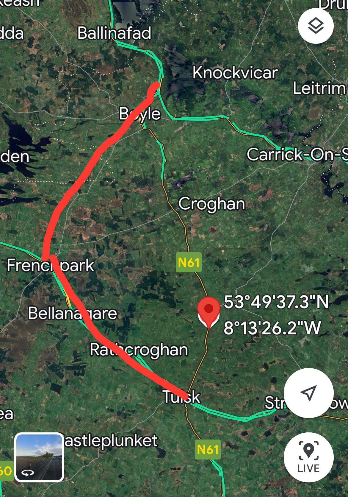 "This would have been the direct route to Roscommon for anyone travelling through Sligo. Diversion routes are in place from Boyle via Frenchpark, and back onto the N5 at Tulsk. Anybody travelling from the Carrick-on-Shannon direction can follow the R368 via Elphin, Strokestown, Four Mile House and onto Roscommon. On a normal day, this would add five minutes to the journey."