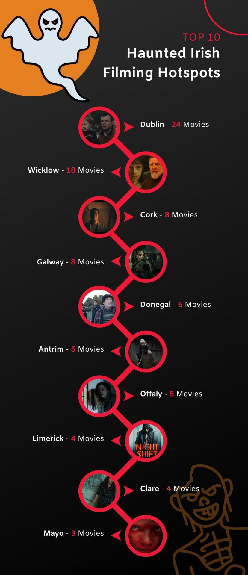 Coming in fifth place is Donegal, which has featured in an impressive six horror films. Ahead are Dublin in first place with 24 films and Wicklow in second with 18. Cork is in third with eight films, and Galway is fourth with eight as well.
