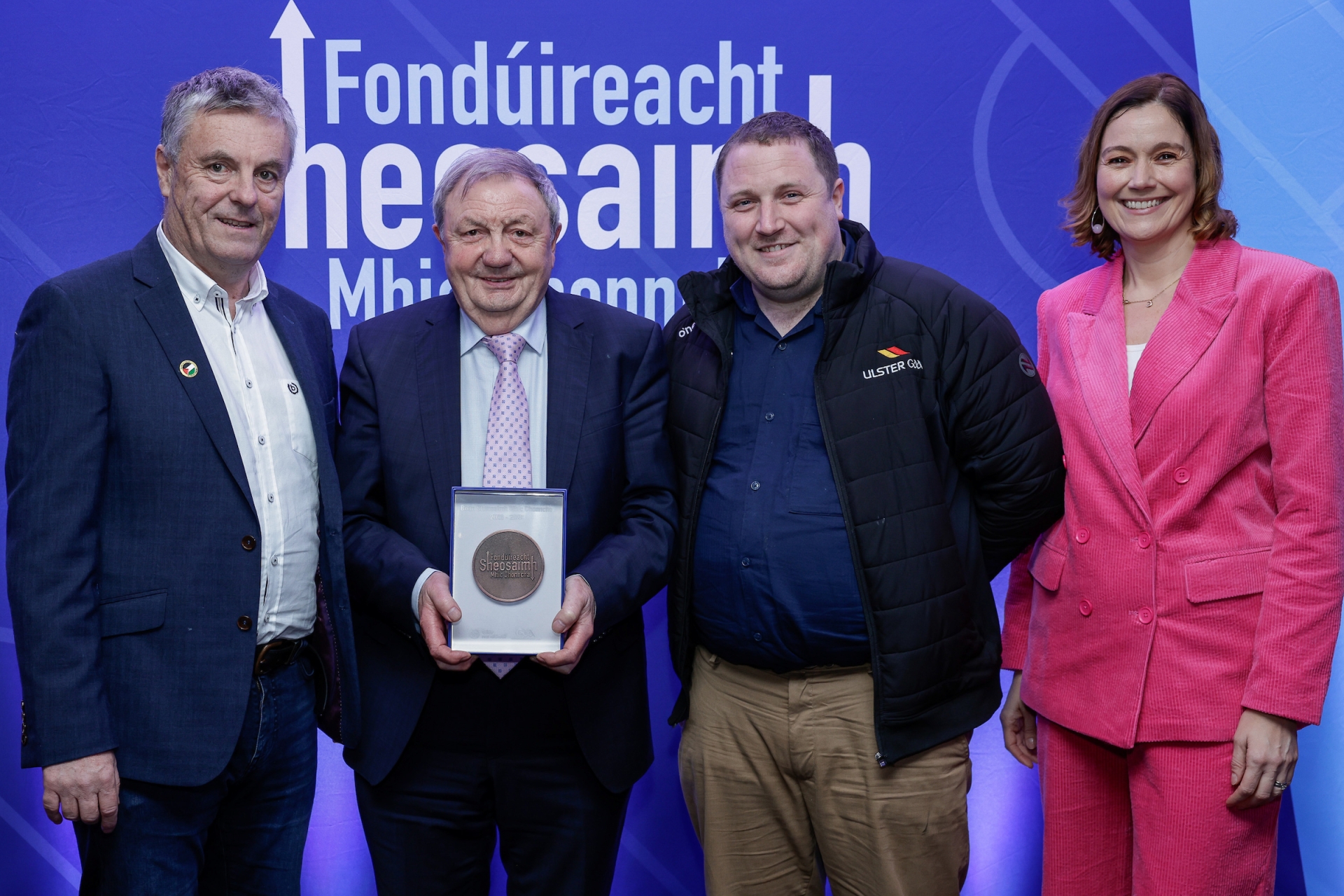 John Carr from CLG Na Dúnaibh receiving a bronze Seosamh Mac Donncha Irish language award from Lorcán Mac Gabhann, Chief Executive of Glór na nGael, Ciarán Mag Uidhir, Ulster GAA Irish language officer and sports broadcaster, Gráinne McElwain