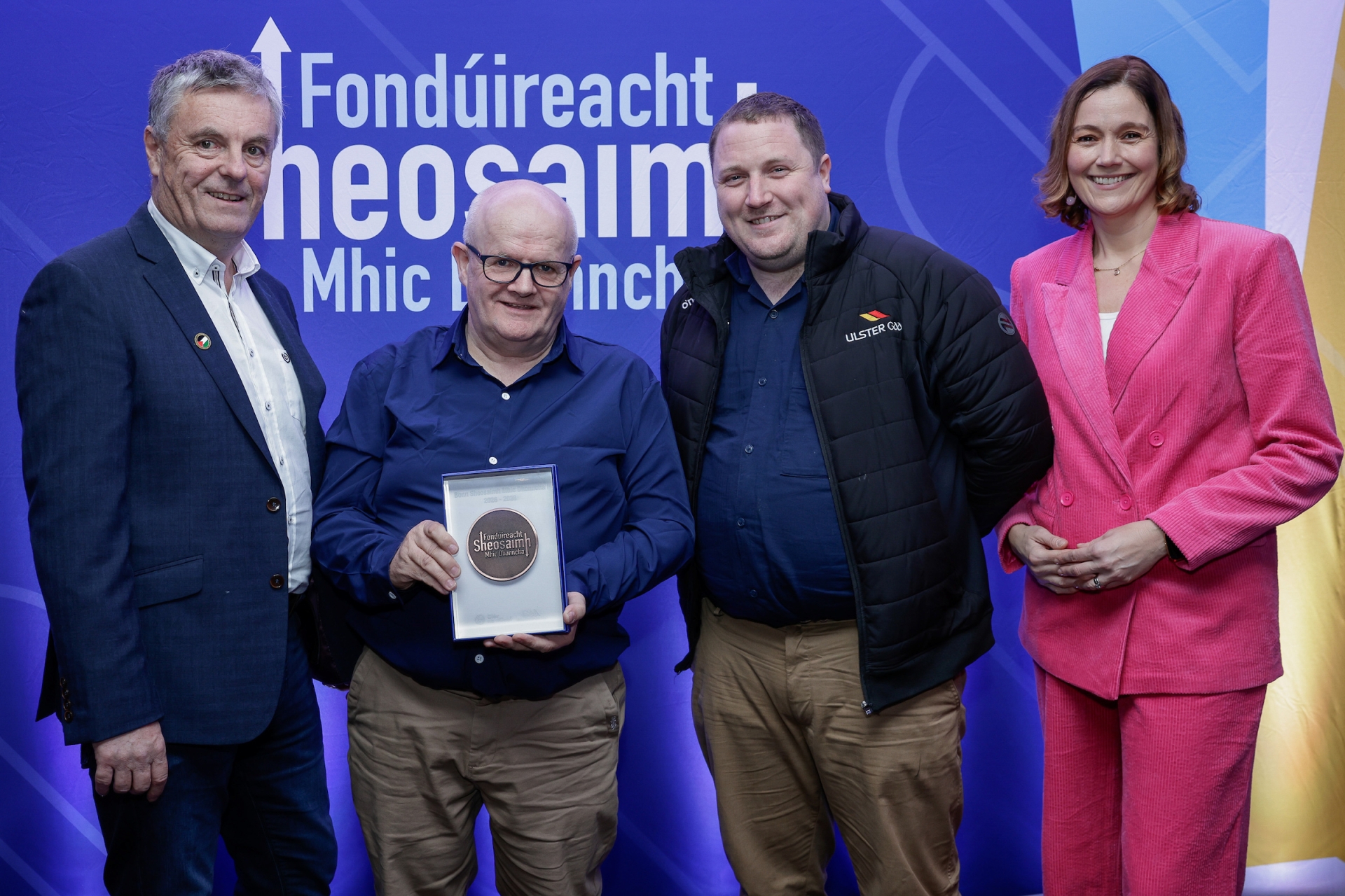 Maureen and Tony Ó hAnnluain from Na Rossa CLG receiving a bronze Seosamh Mac Donncha Irish language award from Lorcán Mac Gabhann, Chief Executive of Glór na nGael, Ciarán Mag Uidhir, Ulster GAA Irish language officer and sports broadcaster, Gráinne McElwain