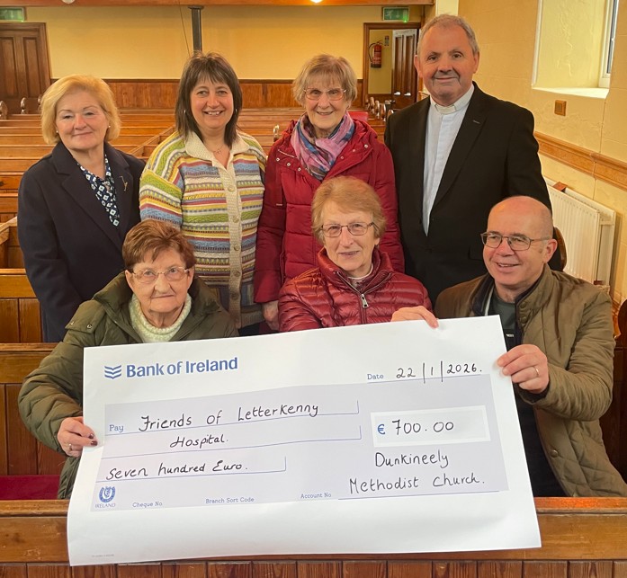 Ed Wickes, Treasurer of the Friends of Letterkenny University Hospital, accepted a donation of €700 from Carole Long on behalf of Dunkineely Methodist Church.