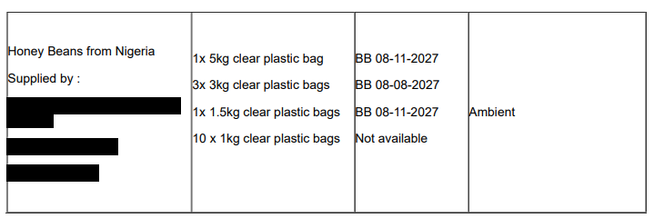 The HSE inspector noted that a certain food product, Honey Beans from Nigeria, did not comply with certain legislation and the premises was prohibited from selling the product with immediate effect.