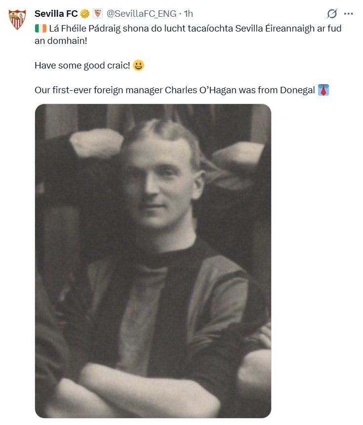 "Lá Fhéile Pádraig shona do lucht tacaíochta Sevilla Éireannaigh ar fud an domhain!," they posted on X. "Have some good craic! Our first-ever foreign manager Charles O’Hagan was from Donegal."