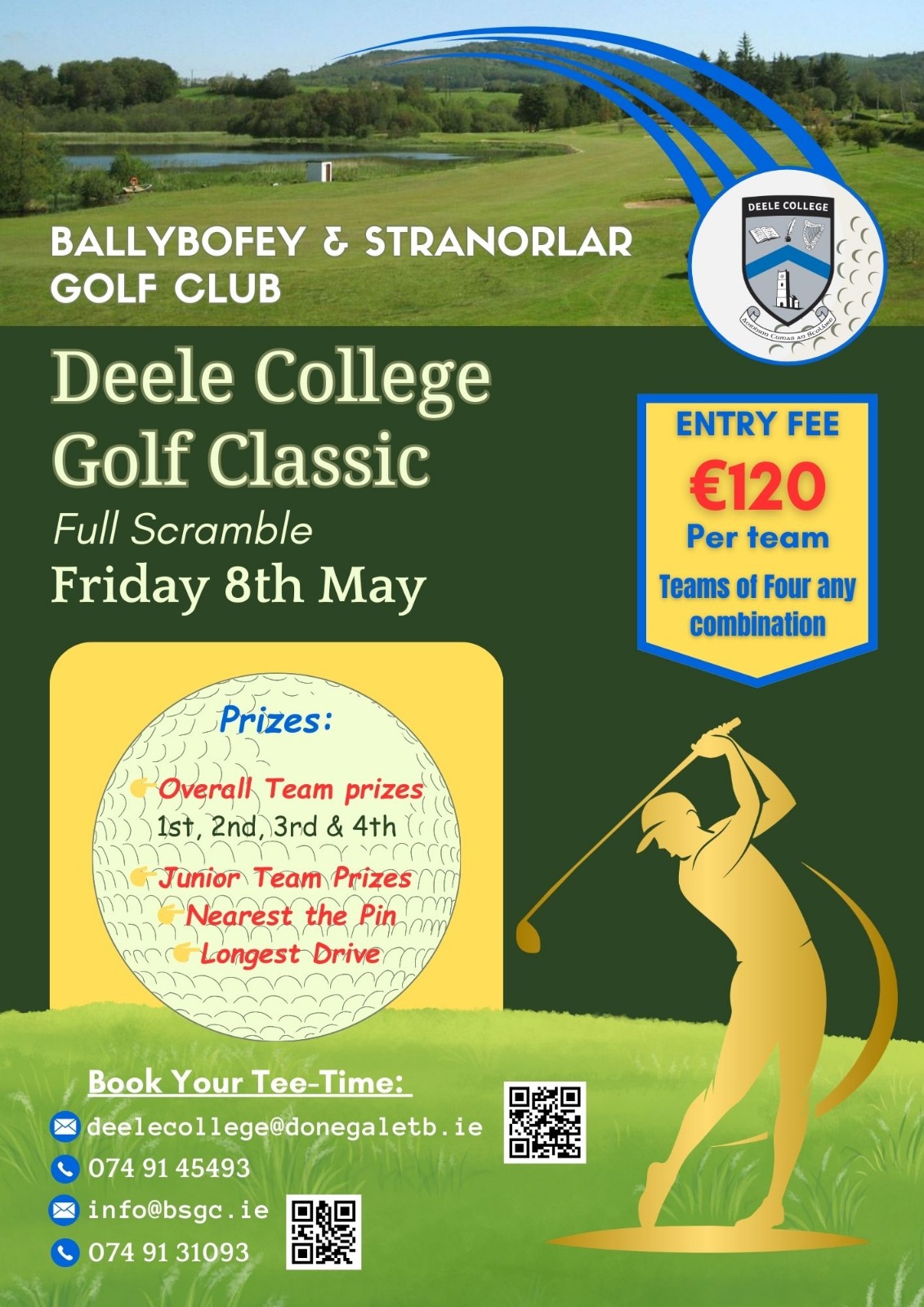 To register a team or become a sponsor, please contact Joe Boyle at Deele College on 074-9145493 or joeboyle@donegaletb.ie or Ballybofey and Stranorlar Golf Club on 074-9131093 or info@bsgc.ie by Thursday 7th May, 2026. We encourage you to register your tee times as early as possible, as tee times are allocated on a first-come-first-served basis from 8.00am to 5.40pm.
