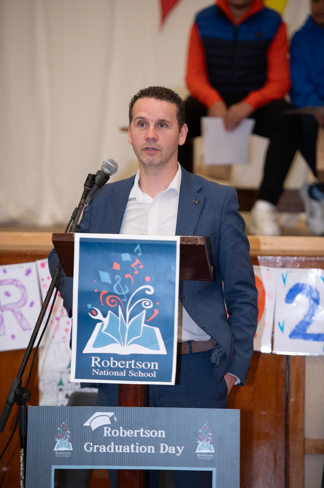 Special Guest, Séan McFadden, principal Finn Valley College speaking at the Robertsons National School presentations and 6th Class graduation event.
