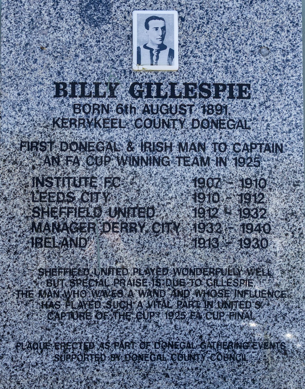 Billy Gillespie died in 1981, just a month before he would have turned 90. In September 2013, a commemorative plaque was unveiled by his granddaughter Jane Bull at Rab's Park, Kerrykeel, the local sports field where he first played football. He, like Gallacher and McGrory, will never be forgotten.