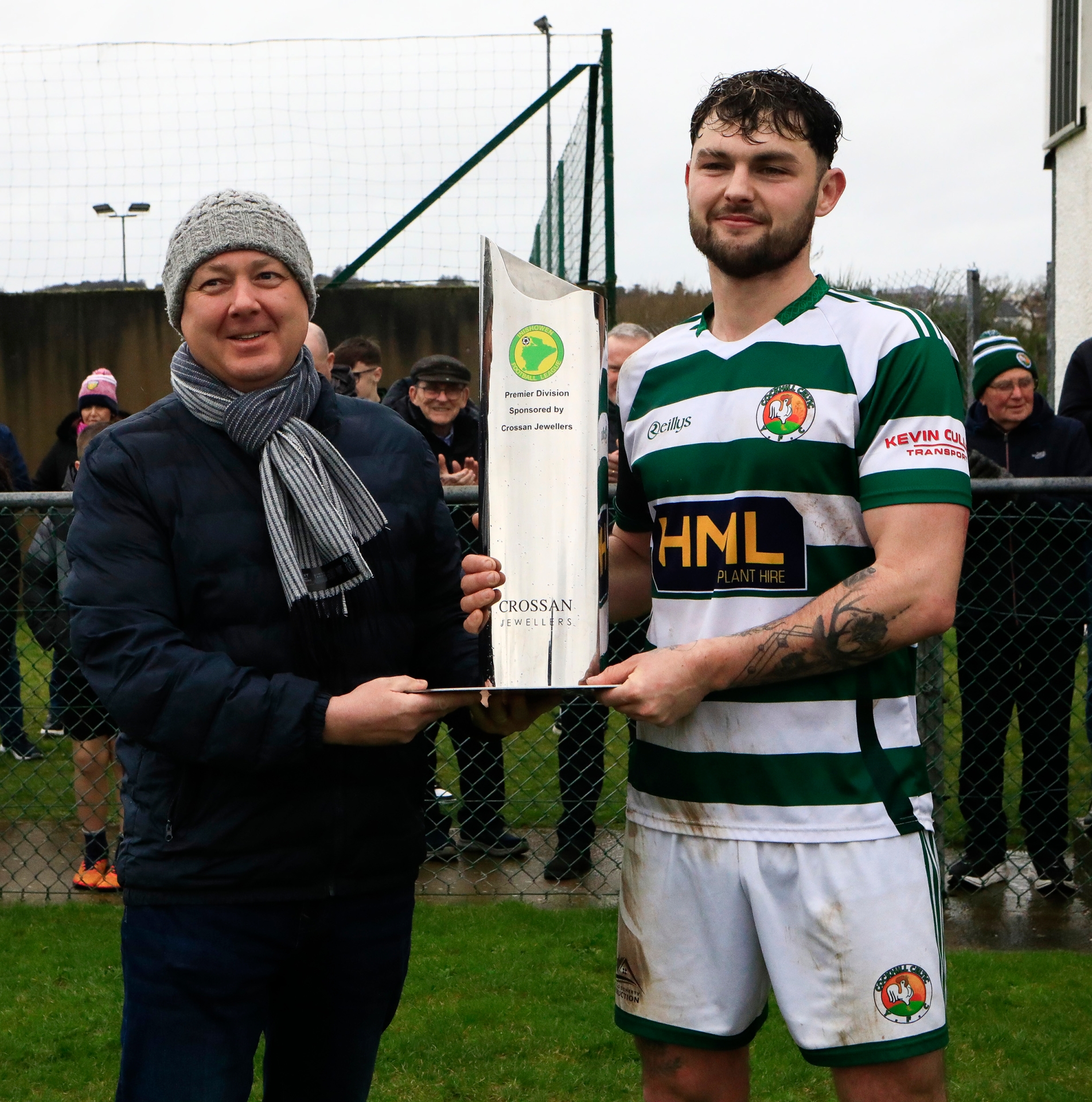 Team captain Lee McLaughlin receives the Jackie Crossan Premier Division trophy from competition sponsor rep Shane Crossan