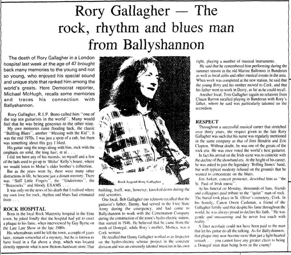 The death of Rory Gallagher in a London hospital last week at the age of 47 brought back many memories to the young and not so young, who enjoyed his special sound and unique style that ranked him among the world's greats. Here Democrat reporter, Michael McHugh, recalls some memories and traces his connection with Ballyshannon.