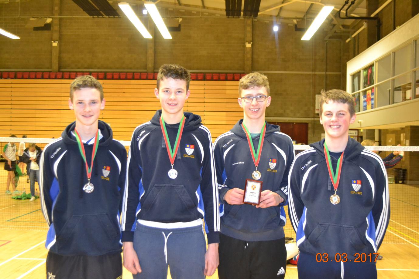 These fantastic results meant the Minor Boys qualified for The All-Ireland Schools' Finals in Gormanston, Co. Meath, on Wednesday 13th March. An early start at 6am saw some sleepy heads entering the bus. Just over 3 hours later we were in Gormanston, the sleepy boys had transformed into enthusiastic badminton players anticipating the day’s line-up. The 1st match was against Leinster representatives Terenure. Terenure arrived with 4 teams so we knew by their dominant presence they were not to be messed with. The 1st match got underway Benjamin Darragh took on a rival from the Irish front, Luke Davis. The fast speed of the shuttle unset Luke’s game and Benjamin mopped up all of Luke’s mistakes and with every point Benjamin grew in confidence and widened the distance on the scoreboard until Benjamin 30-22. Luke Magee beat Conn Murray 30-19, Lewis Kee beat Ronan Quinn 30-16 & Jamie Kee beat Oisin Shannon 30-24. Benjamin & Luke took their doubles 30-18 followed by an affirming double win by Lewis & Jamie 30-15. The best start possible!!