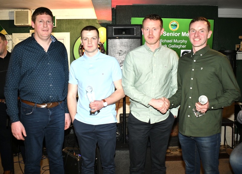 Jack Gallagher and Gary Mc Fadden on behalf of Michael Murphy receive awards in recognition for Playing with Donegal Senior Men’s team presented by Paul Mc Cool and Eamonn Moy