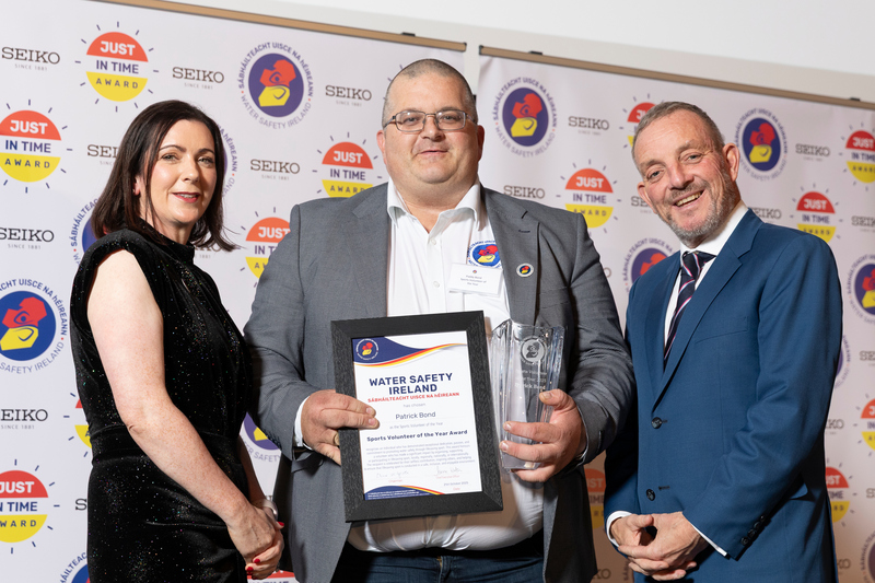Patrick Bond is presented with the Sports Volunteer of the Year Award by Joanne Walsh, CEO, Water Safety Ireland (left) and Jerry Buttimer, TD, Minister of State at the Department of Rural and Community Development and the Gaeltacht (right).