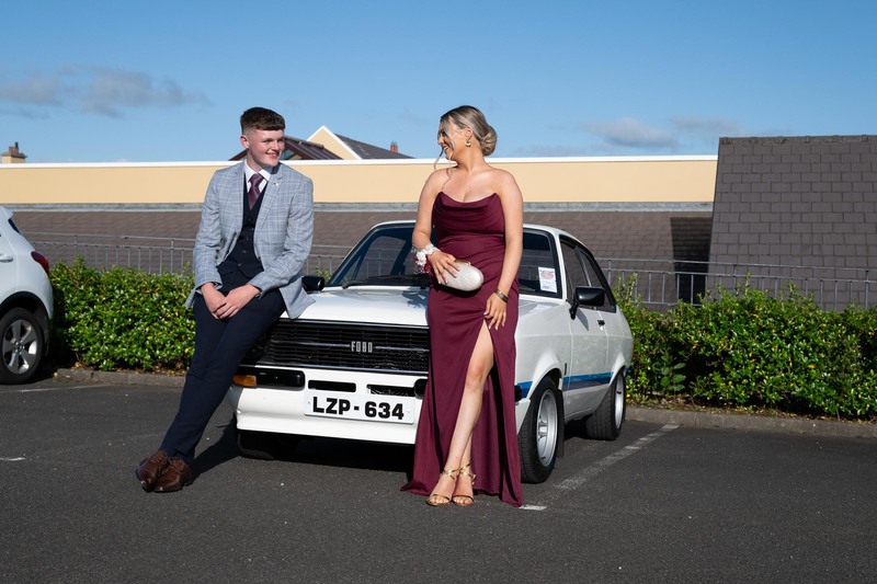 Mark Hunter and Aoife Carr after ariving in a MKii Escort at the Mulroy College Prom in the Silver Tassie on Wednesday last. Photo Clive Wasson