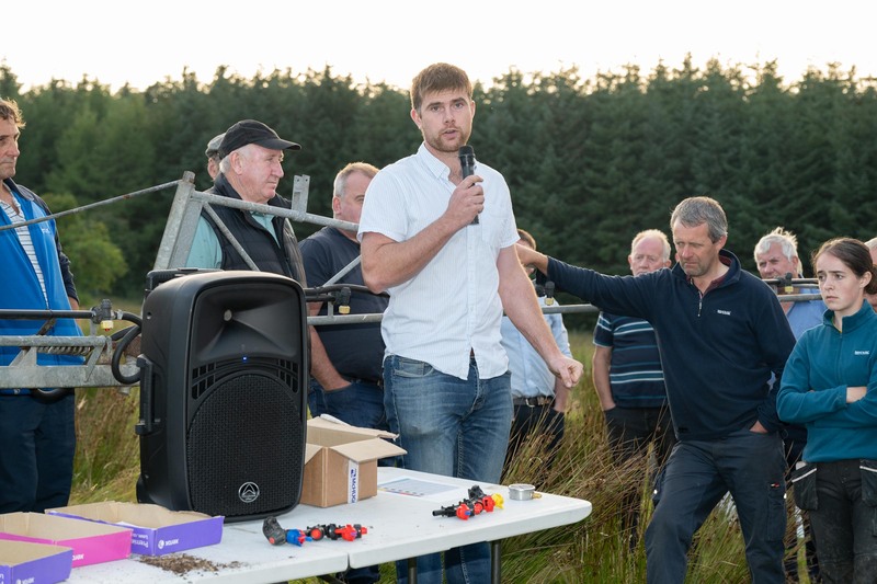 Matthew Lecky, speaking about sprayer issues at the Teagasc Rush and Upland Management Event on the farm of Redmond & Donna McMonagle, Letterkenny on Wednesday last. Photo Clive Wasson