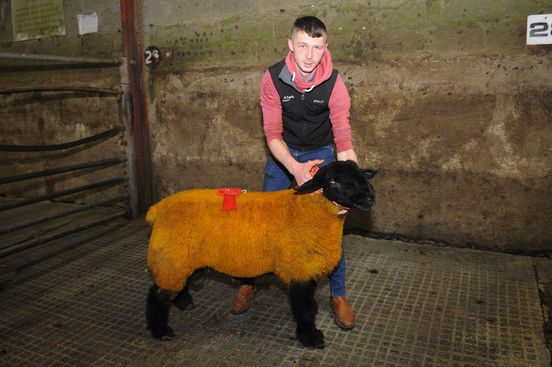 Andrew Lucas pictured with his winner of the Open Ram Lamb section at the Donegal Pedigree Suffolk Breeders Show and Sale in Raphoe Livestock Mart on Friday last