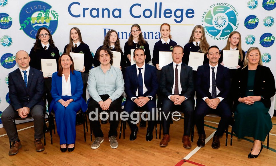 Students who received "Multiple Distinctions at Junior Cycle" certificates at the Crana College Prizegiving. Included are Sinead Anderson, vice-principal, Dr. Patrick Lynch, special guest, Liam Baldrick, special guest, Kevin Cooley, principal, and Philip McGuinness, vice-principal and Clare Bradley