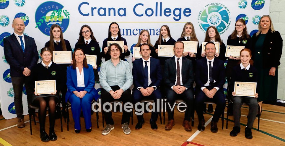 Students who received "Common and Higher Level Distinctions at Junior Cycle" certificates at the Crana College Prizegiving. Included are Sinead Anderson, vice-principal, Dr. Patrick Lynch, special guest, Liam Baldrick, special guest, Kevin Cooley, principal, and Philip McGuinness, vice-principal