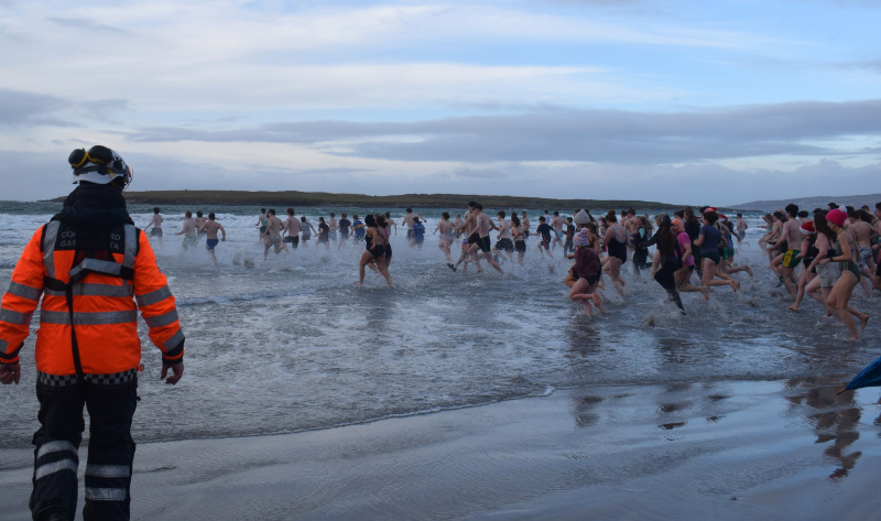Narin Strand was a hive of activity as an estimated 600 people gathered for the annual New Year’s Day swim. Click on the arrows to see Siobhan McNamara's photos: