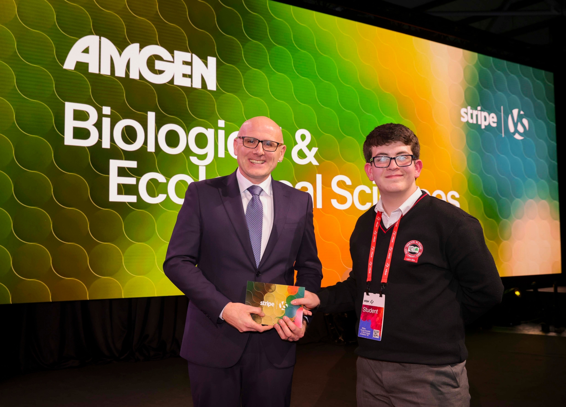 Ray McGrath, Chair of the Judging Panel from Stripe, presents the 3rd Junior Individual Award to Tomas Downey, from Rosses Community School, for the project “Jellyfish Barriers for Bathing Areas.”